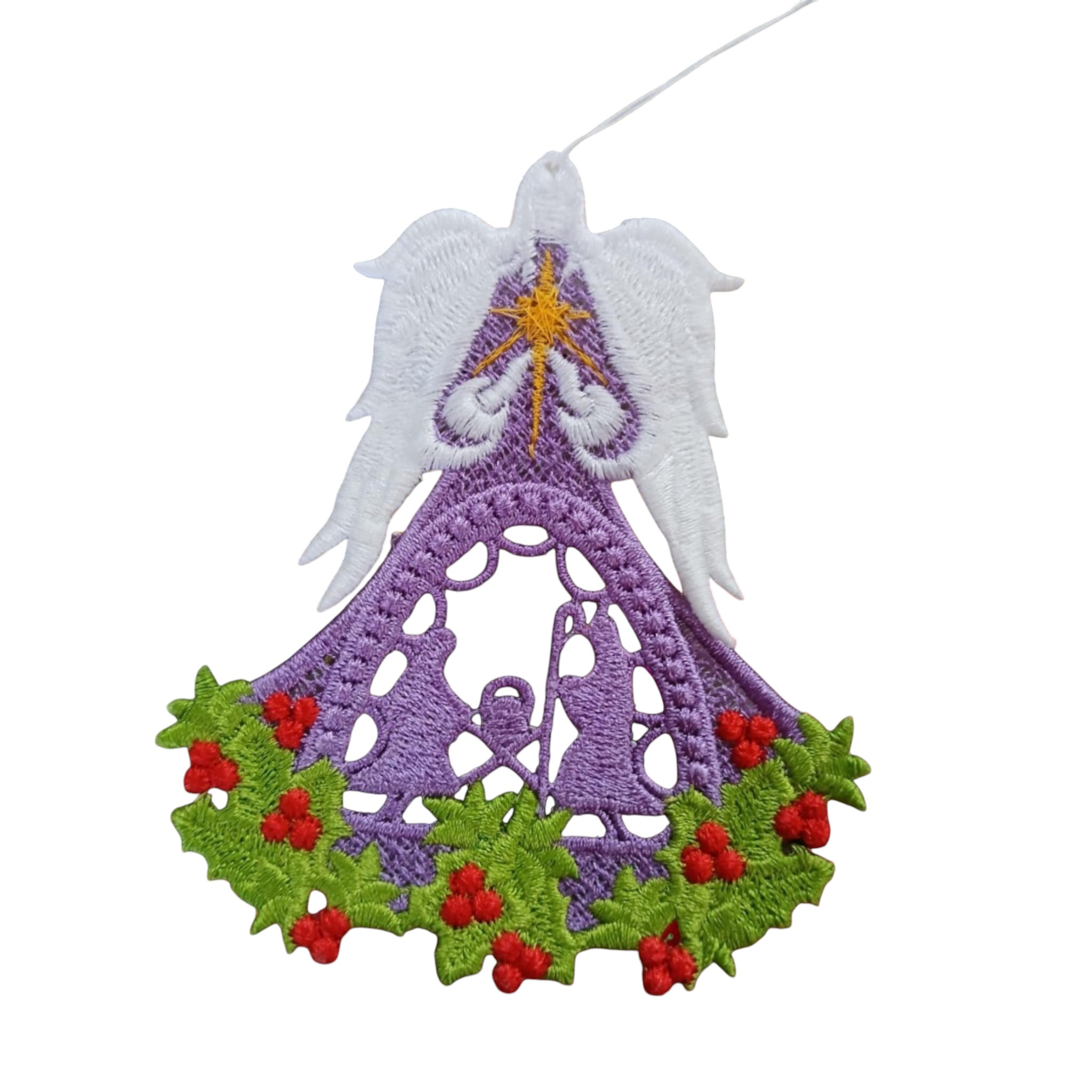 I embroidered these Angels in colors of lilac, green, red, gold and white. Has a Manger design in the middle. They measure 4 inches wide and 3 inches long. Has a white yarn thread for hanging.