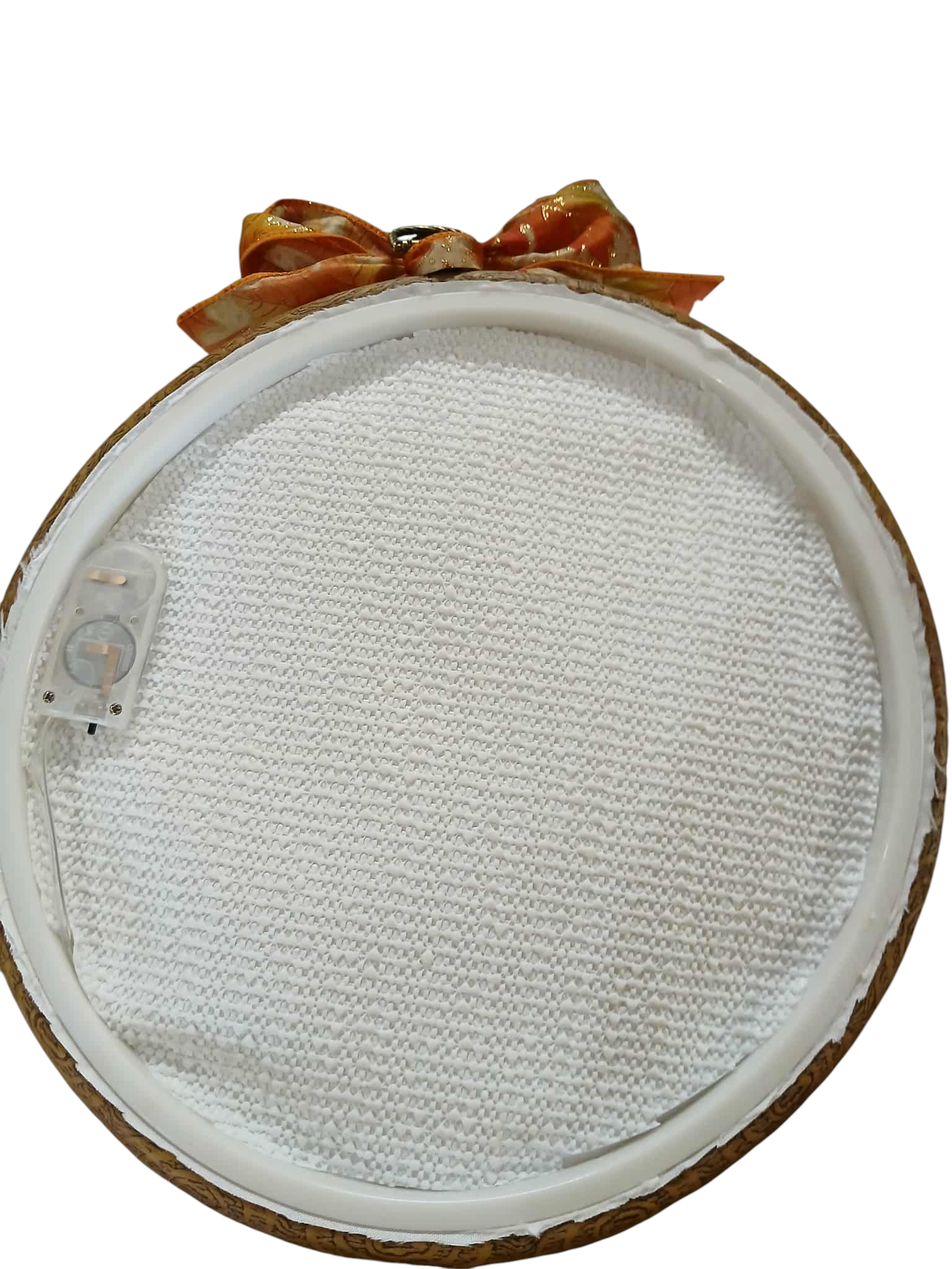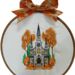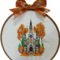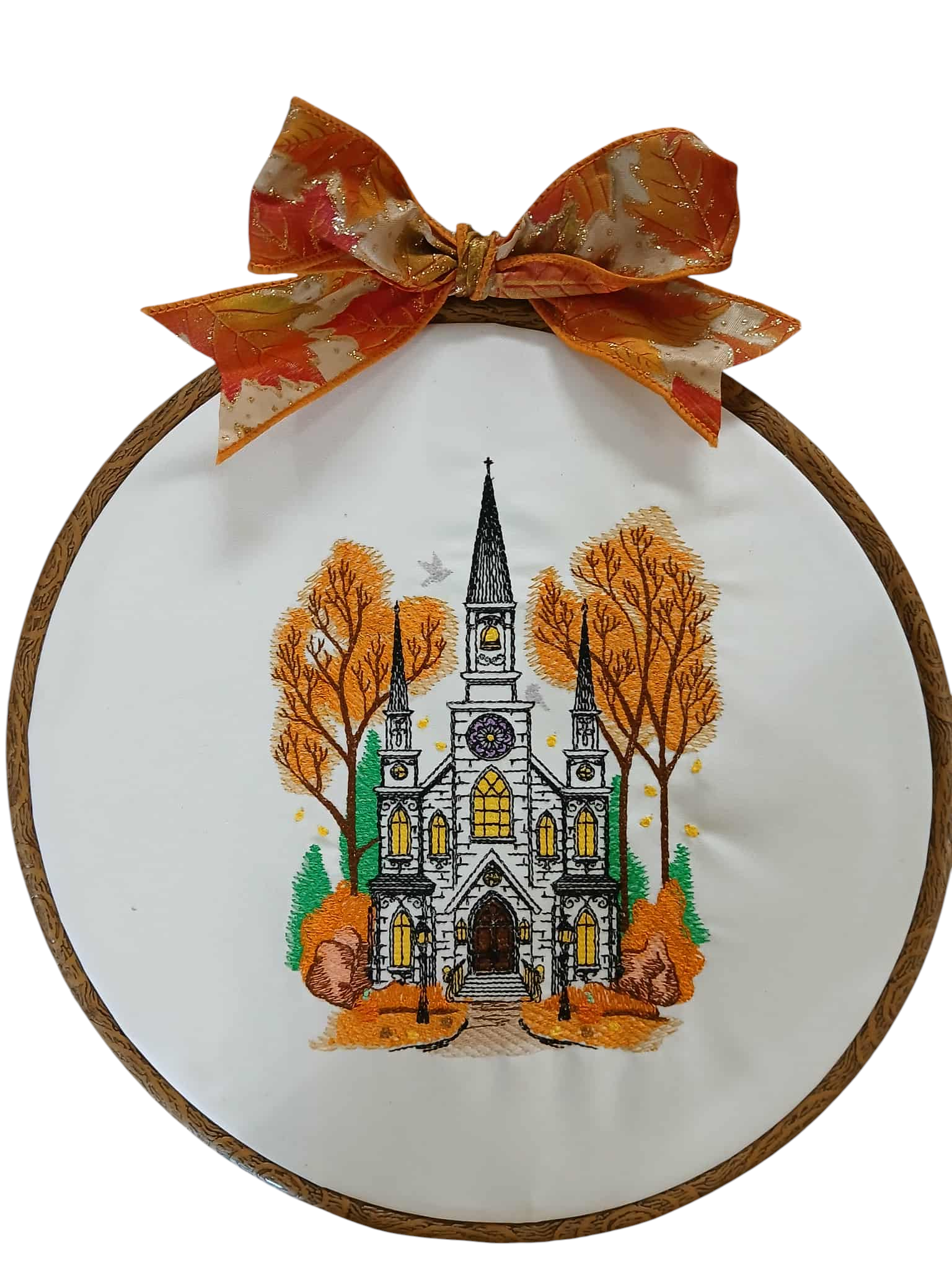 This is a cute 10 inch wooden hoop that I embroidered a Church with Fall colors. on satin fabric. Has Leaf design Bow trim on top. Applied lights on the back that come thru on the front. Make a great Fall Decor.